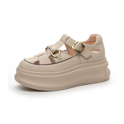 AI牛皮包头运动凉鞋女2024夏季新款女鞋子厚底休闲鞋外穿镂空罗马鞋 杏色 35
