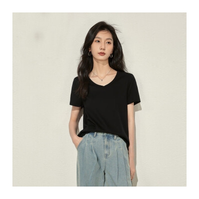 啄木鸟休闲简约纯色棉短袖t恤女V领宽松正肩百搭上衣夏 黑色 L