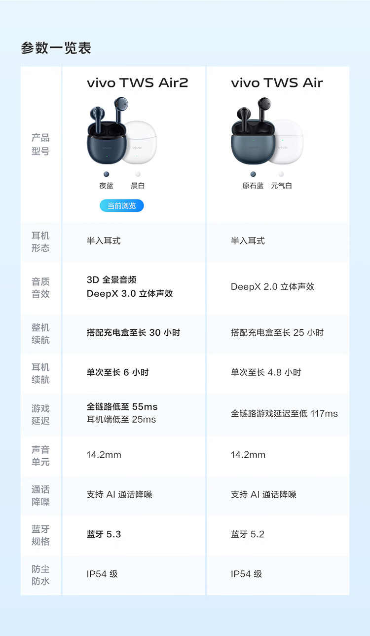商品名称:vivo TWS Air2 夜蓝 环绕重低音 3.6g超轻盈无感佩戴 30小时长续航 通用小米苹果华为手机 vivotwsair2