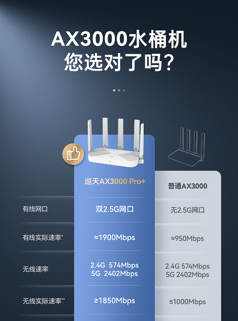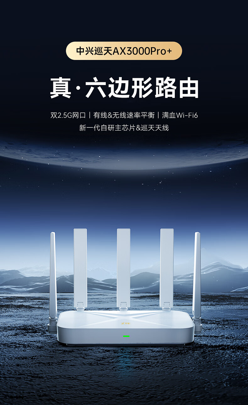 商品名称:中兴(ZTE) 巡天AX3000Pro+路由器 5G双频超千兆双2.5G Mesh无线路由器 WIFI6 电竞路由穿墙大覆盖