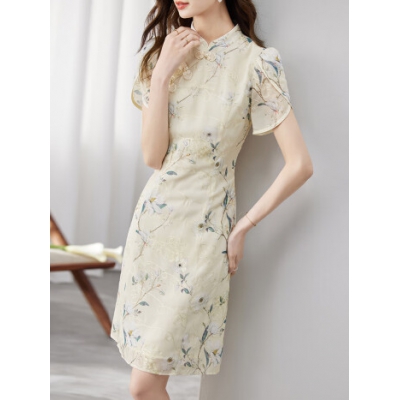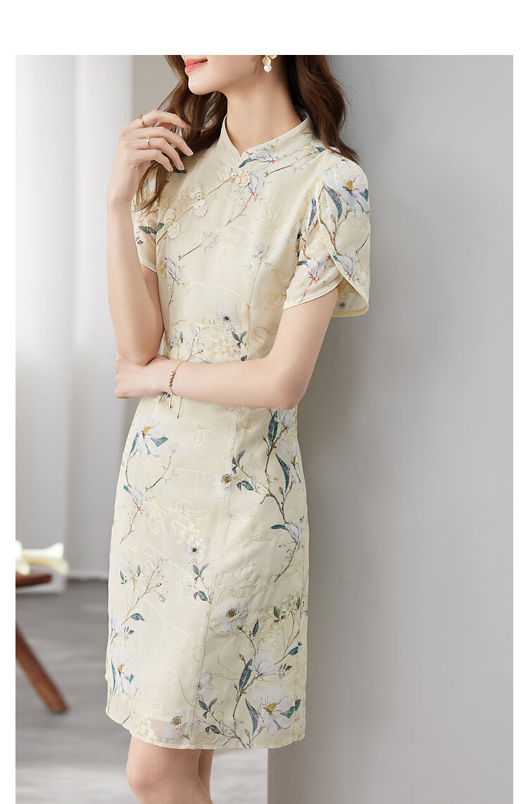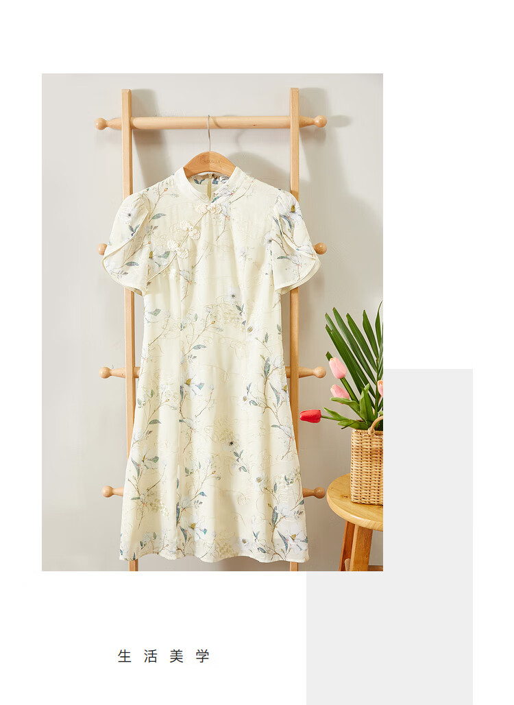 尚都比拉新中式立领盘扣旗袍改良版花瓣袖雪纺碎花连衣裙夏季 杏底花色 L