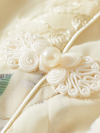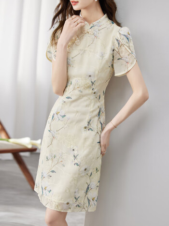 尚都比拉新中式立领盘扣旗袍改良版花瓣袖雪纺碎花连衣裙夏季 杏底花色 L