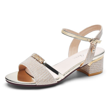 AI中跟凉鞋女2024夏季新款女鞋粗跟鱼嘴鞋一字扣带皮凉鞋时装妈妈鞋 金色OYLL98038 37
